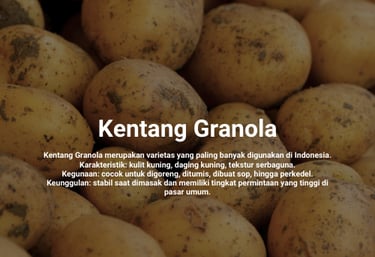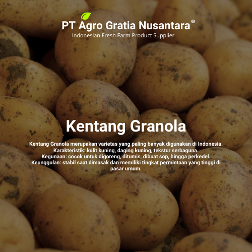 Kentang Granola merupakan varietas yang paling banyak digunakan di Indonesia. Karakteristik: kulit kuning, daging kuning, tekstur serbaguna. Kegunaan: cocok untuk digoreng, ditumis, dibuat sop, hingga perkedel. Keunggulan: stabil saat dimasak dan memiliki tingkat permintaan yang tinggi di pasar umum.