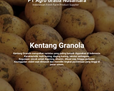 Dengan pengalaman, teknologi, dan koneksi industri yang mereka bangun, PT AGRO GRATIA NUSANTARA berkomitmen menghadirkan solusi pasokan kentang yang efisien, terjangkau, dan berkualitas tinggi bagi seluruh pelaku usaha di Indonesia.
